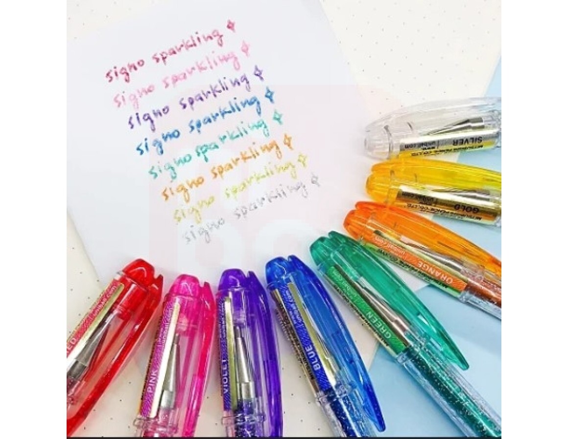 Um mimo que vai encantar as loucas por papelaria, a Caneta Gel Glitter Uniball Signo Spakling Ouro é ótima para escrever em papeis brancos, pretos e coloridos. Perfeita para mimar pessoas especiais que são apaixonadas por canetas coloridas!